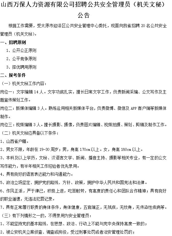 根據(jù)工作需要,經(jīng)古交市政府批準(zhǔn),現(xiàn)面向古交市公開招聘輔助工作人員30名。招聘工作由山西萬保人力...